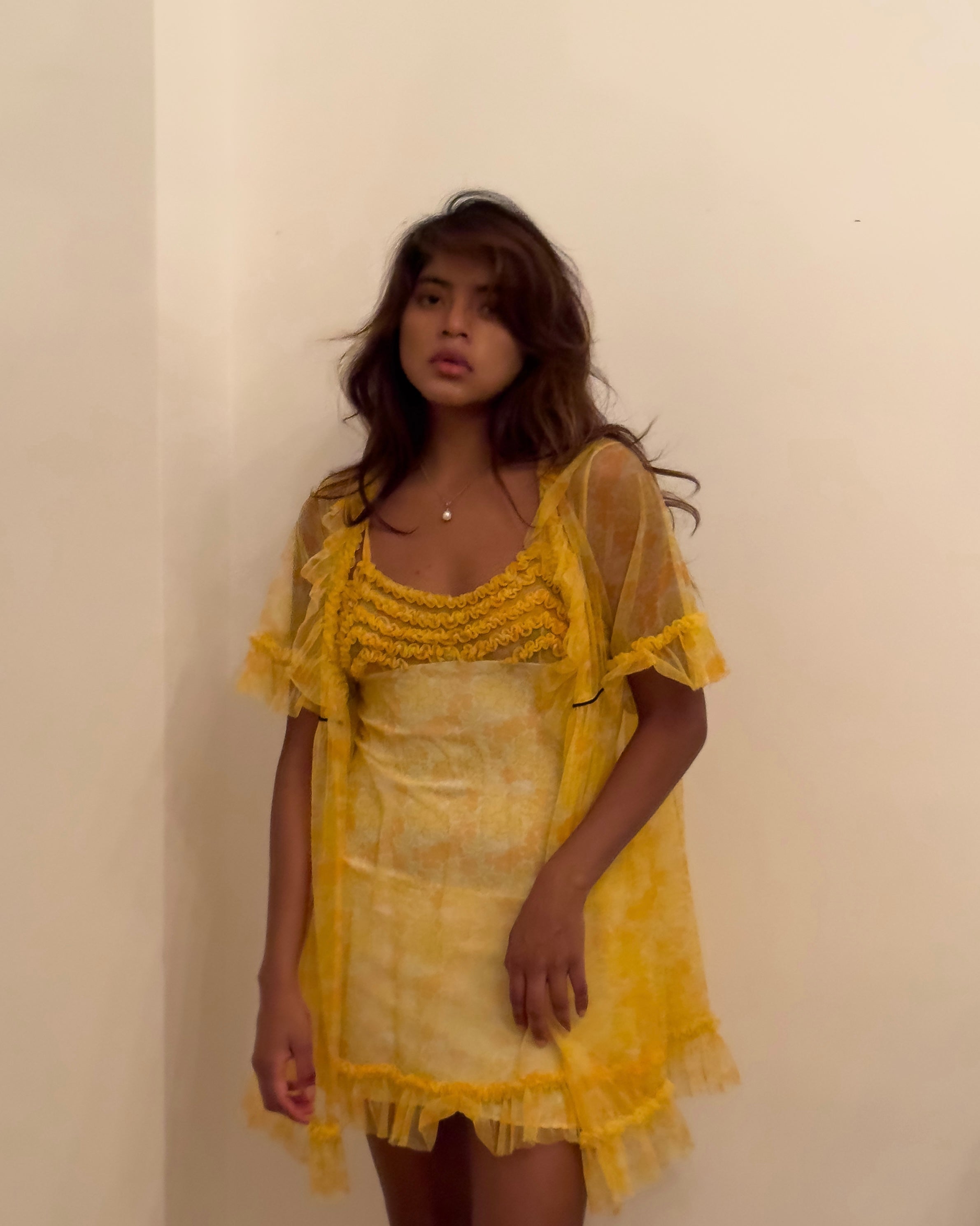 Stretch spaghetti dress with matching coat, made of yellow patterned mesh fabric
